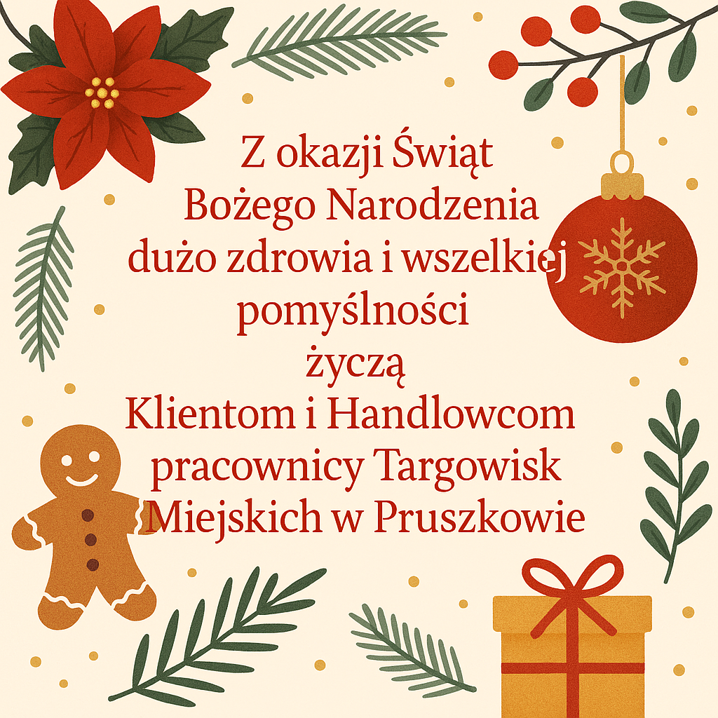 Informujemy, że w środę 24.12.1025 (Wigilia) targ na Żbikowie przy ul. Pańskiej będzie nieczynny.